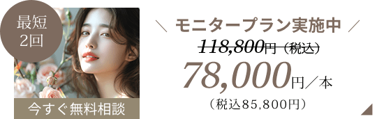 現在、クイックビューティべニアの施術を通常よりもお得に受けていただけるモニター価格プランをご案内しています。対象は、お顔や口元のお写真撮影にご協力いただけるかたとなります。撮影したお写真は施術例として使用しますが、お名前や個人が特定される情報は一切掲載いたしません。ご希望のかたはお気軽にお問い合わせください。