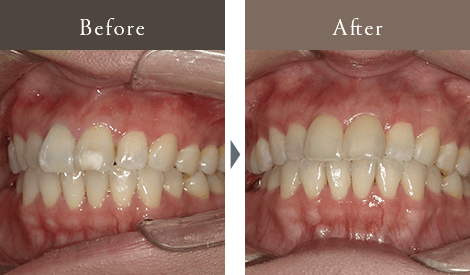 主訴:左上1番のエナメル質形成不全が目立ってしまい気になる。右上1番にも端に白濁があり、2本をまわりの歯と調和するように削らないで治したい。前歯のガタガタが気になる。